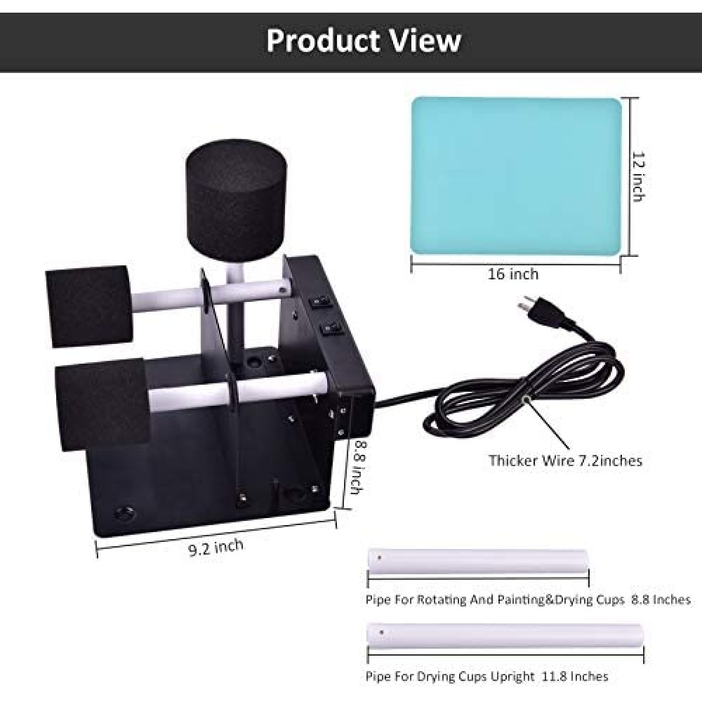 - ??All-in-one cup turner kit? The kit includes 1 x cup turners kit with 4 pvc pipes,4 x foams, 2 x plastic gloves (1 pairs), 1 x silicone brush, 1 x silicone mat (15.7 x 11.8inch), 1 x paper tape. These full abundant tools ensure you can make DIY craft easily,protect your desk surface and won?t dirty your hand. There are also two upright supports which can?t rotate??, you can put the made cup on the 11.81? pipes and perform other cup operations with the 8.66? pipes without delaying your fun.