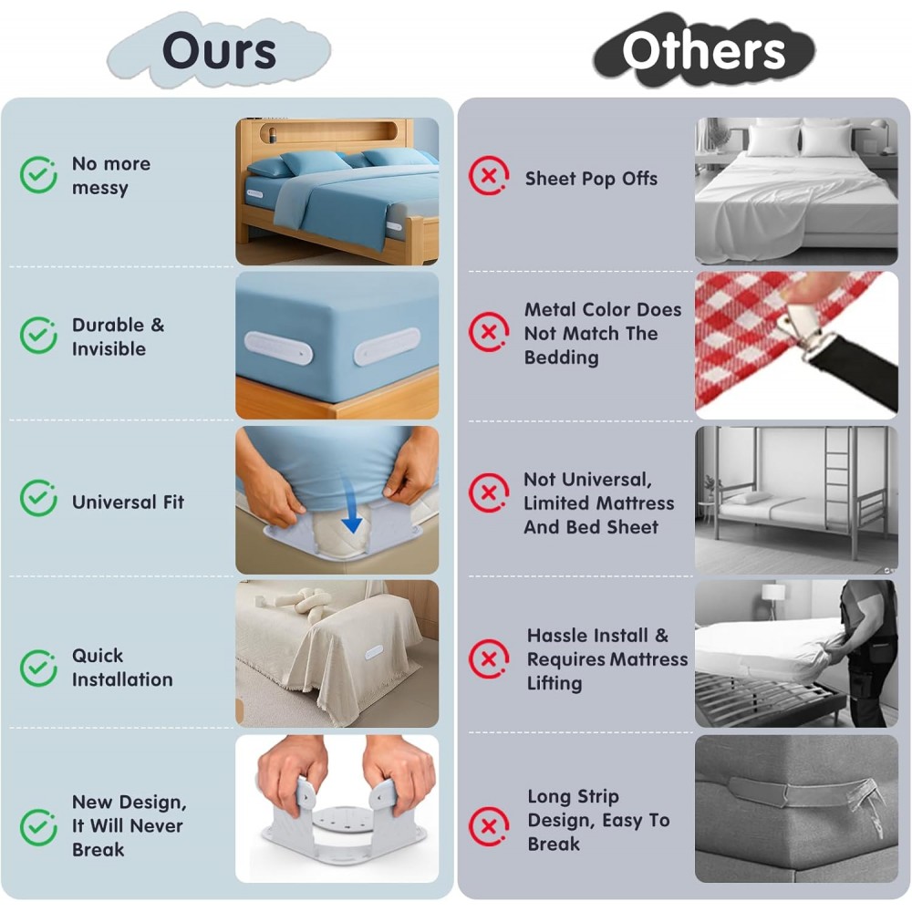 - Easy to Install & Reuse: No need to reinstall every time, making sheet changes quick .Our bed sheet locks are available for one-time installation.Just fix the fitted bed sheet holders in the corner of the mattress.This bed sheet grippers make it effortless to change sheets without having to flip the mattress. You can also remove this sheet holder with ease changing the sheet in next time.