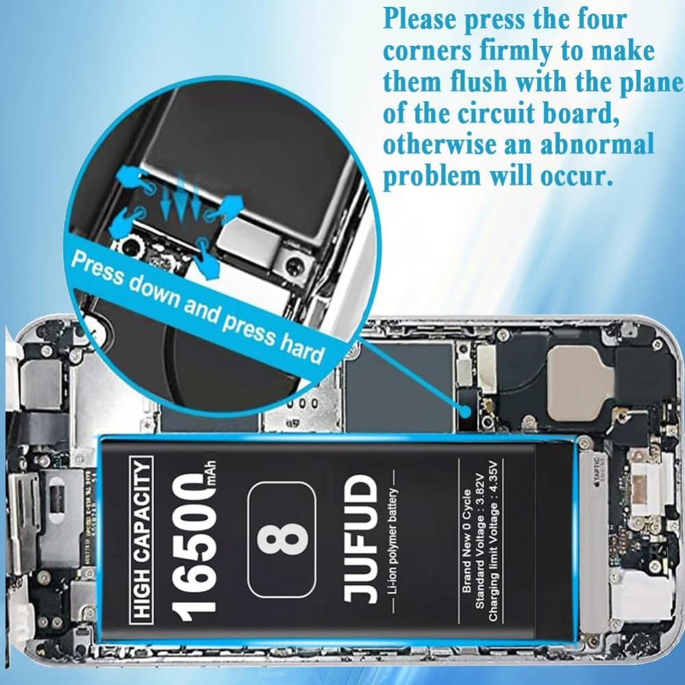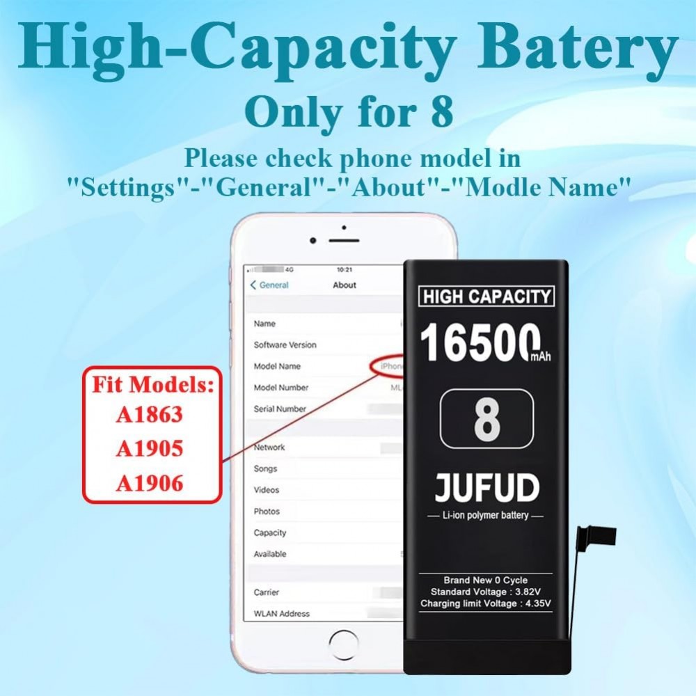 - 【Strong power】JUFUD replacement battery used for iPhone 8/8G, top lithium polymer cell, 16500mAh large capacity, 0 cycles of new electricity, durable to 1800 cycles, strong battery life, goodbye to power anxiety.