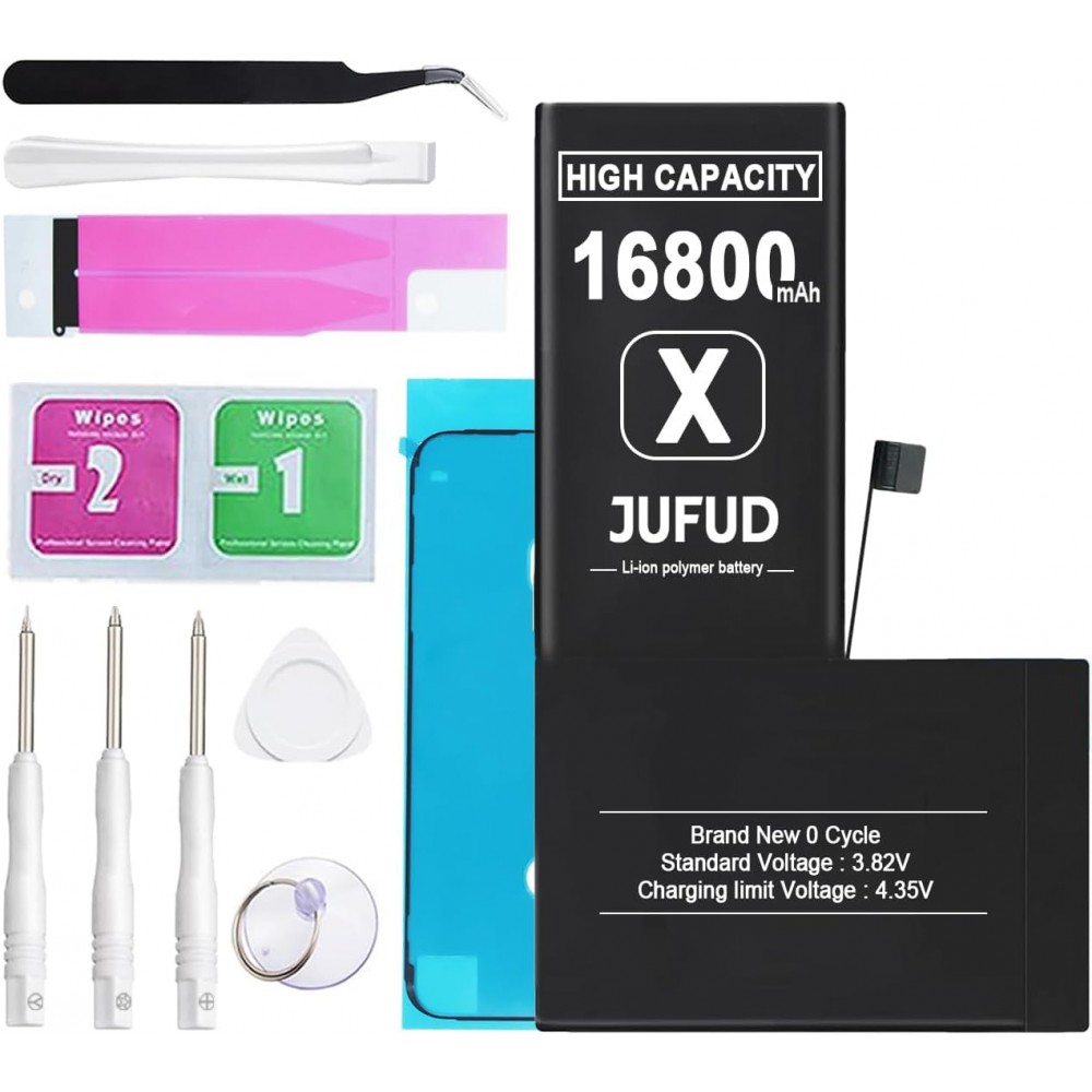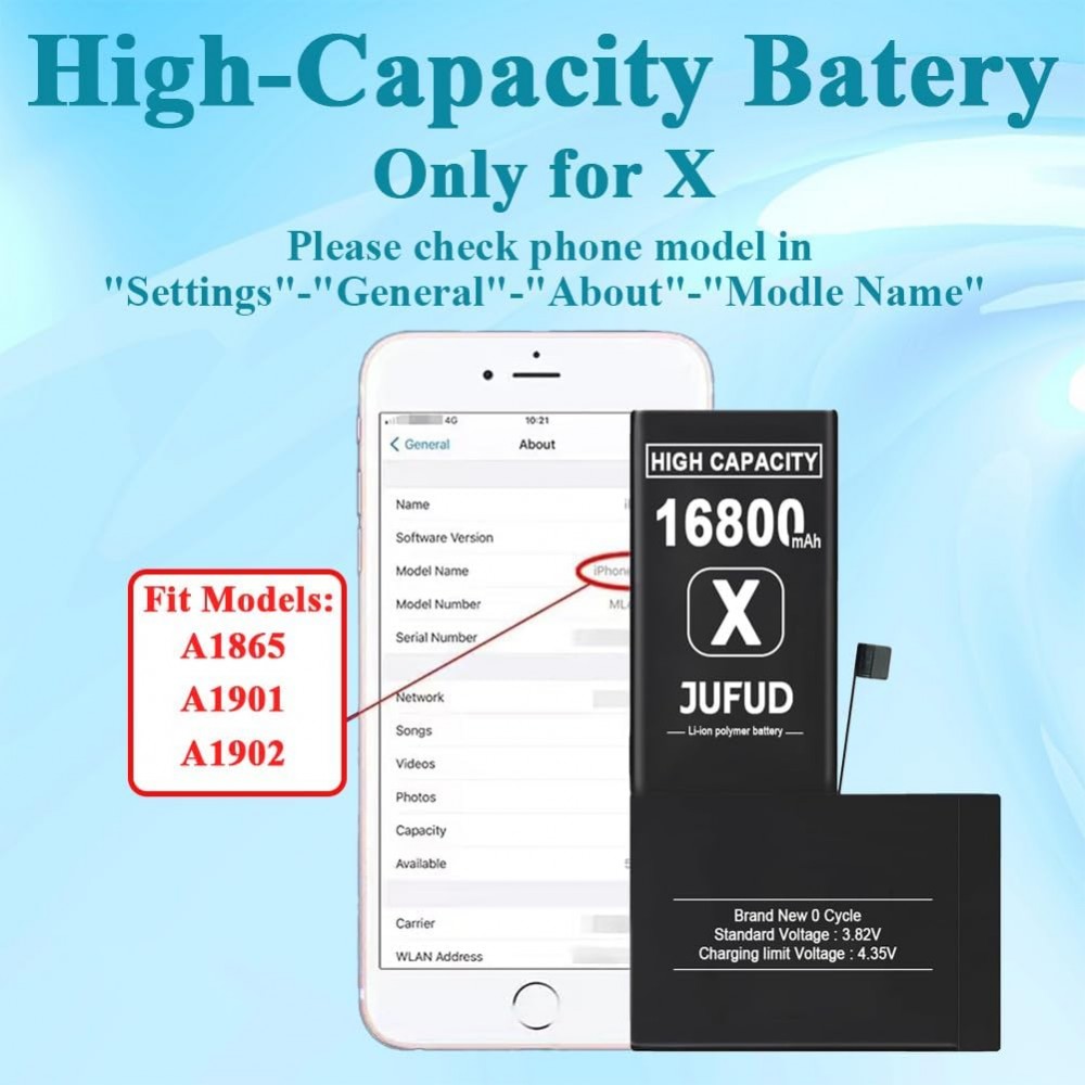 - 【Strong power】JUFUD replacement battery used for iPhone X, top lithium polymer cell, 16800mAh large capacity, 0 cycles of new electricity, durable to 1800 cycles, strong battery life, goodbye to power anxiety.